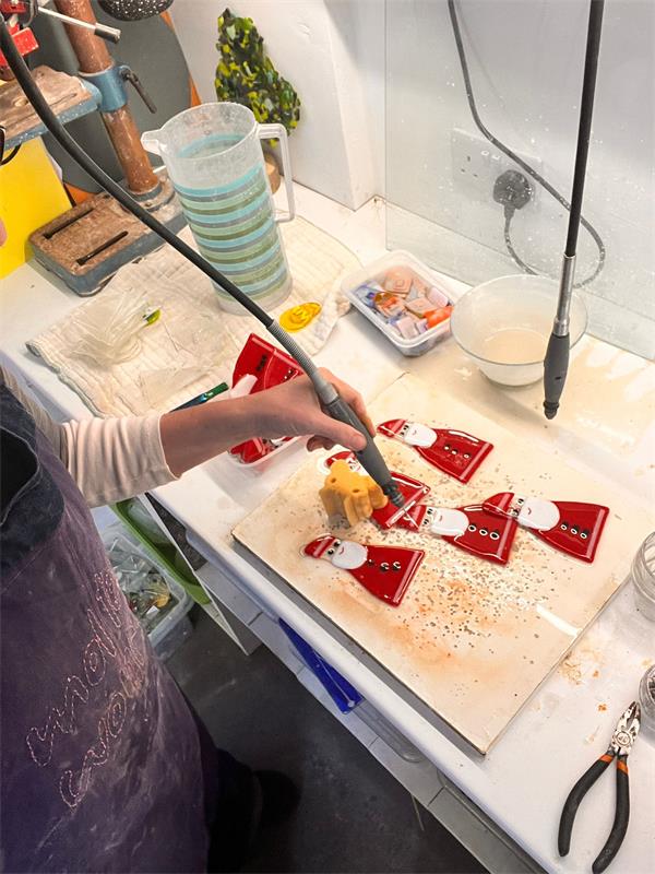 On this particular morning, I was greeted by neat little glass piles of fused glass snowmen, baubles, robins, mistletoe, and Christmas trees in preparation for the busy Christmas gifting season. I also gave out a little sigh of relief because nothing had cracked or gone skewiff — phew!