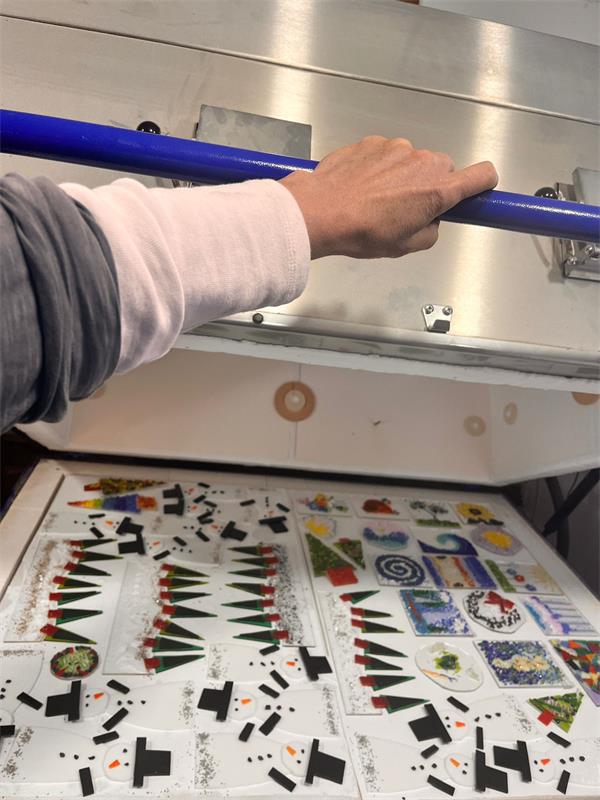 Every morning feels a bit like Christmas when you’re a fused glass artist. Each creation spends around 14 hours inside the kiln, giving the individual glass sheets, frits, and stringers enough time to heat and fuse.