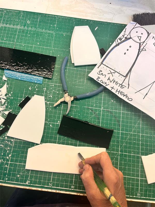 I score and snap pieces of glass into shapes depending on the products I’m making on the day. Usually triangles for trees, semicircles for plump robin bellies, and squares for coasters and kits. When inspiration strikes, I even take this time to draw sketches on scrap paper so I can map out where each piece of glass needs to sit for the best result.