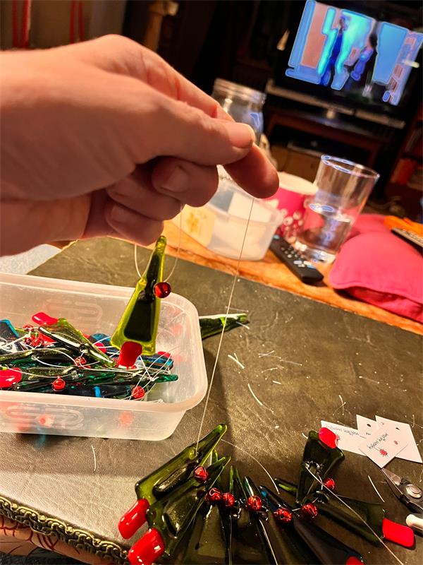 I’ll sit down in front of the TV with a box of fused glass decorations (on this occasion, my lovely Christmas trees), lengths of nylon, and a few jingly bells, and proceed to thread and tie the night away.