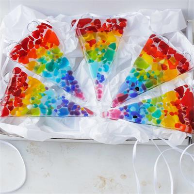Our rainbow bunting DIY fused glass kit allows you to make your very own hanging bunting decoration, which can be used to brighten up windows, shelves, or walls.