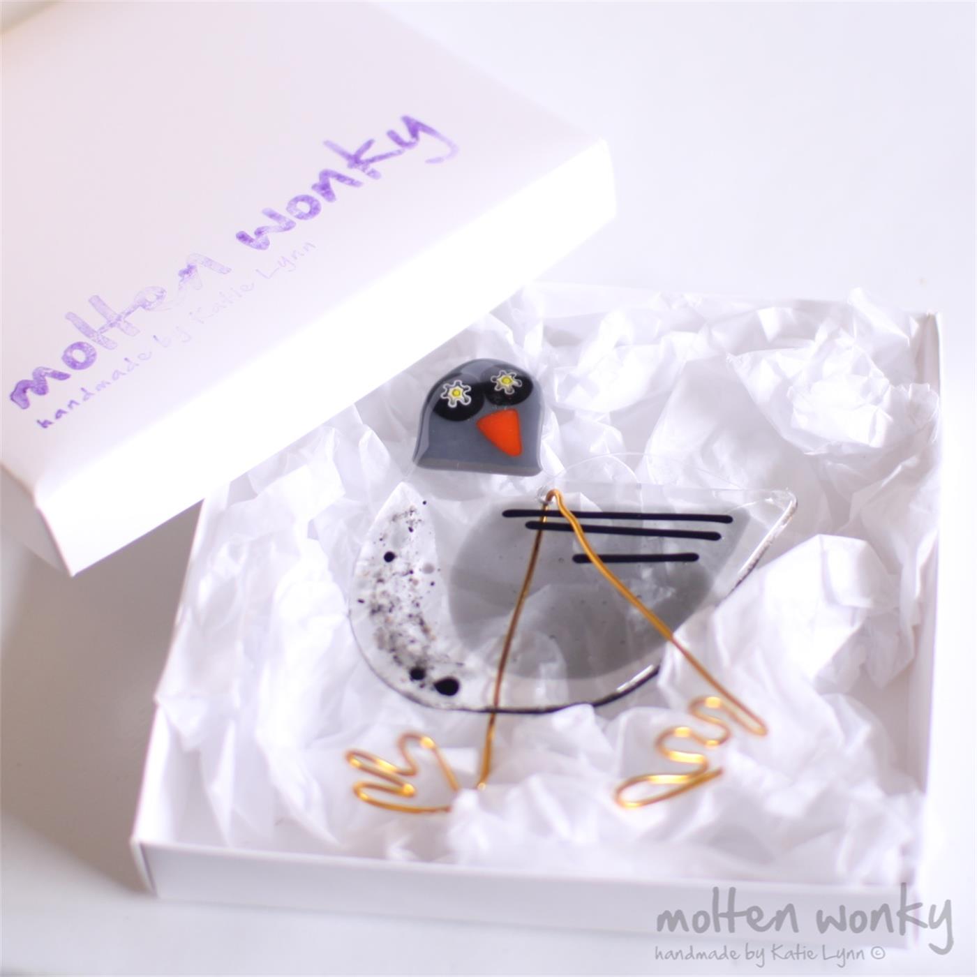 Pigeon is made from a clear glass base with a beautiful soft transparent grey wing. She has an opal grey glass head with a couple of quirky eyes and an orange beak. As with all our birds, Pigeon has fabulous gold dangling wire legs that sway about as she casually hangs in your window!