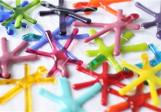 Each star is lovingly made by Katie using 2mm thick fusing glass. She cuts long, thin strips from sheets of transparent or opaque glass, and then trims them down to neat 7cm rods. These rods are then carefully laid over each other on the kiln shelf, fused at a high temperature, and then topped with a glass tab for a nylon hanging cord to be added.