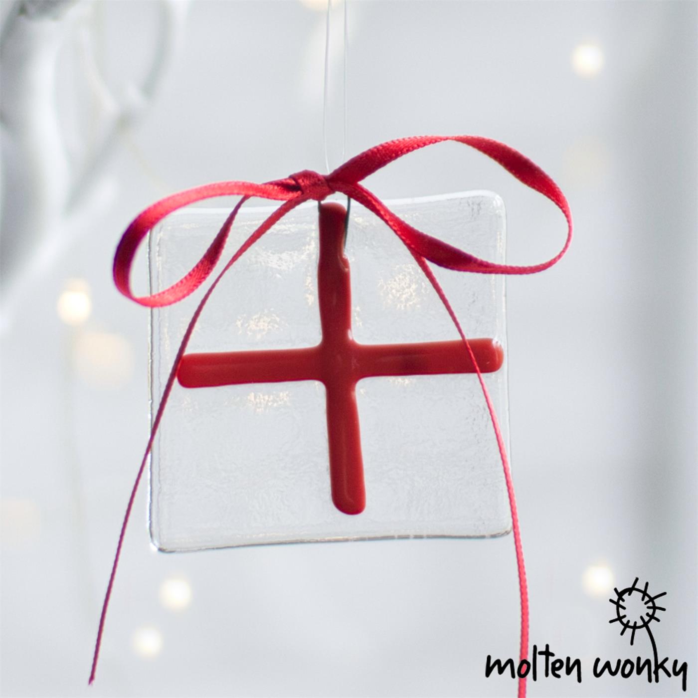 Clear Fused Glass Present Hanging Decoration by molten wonky