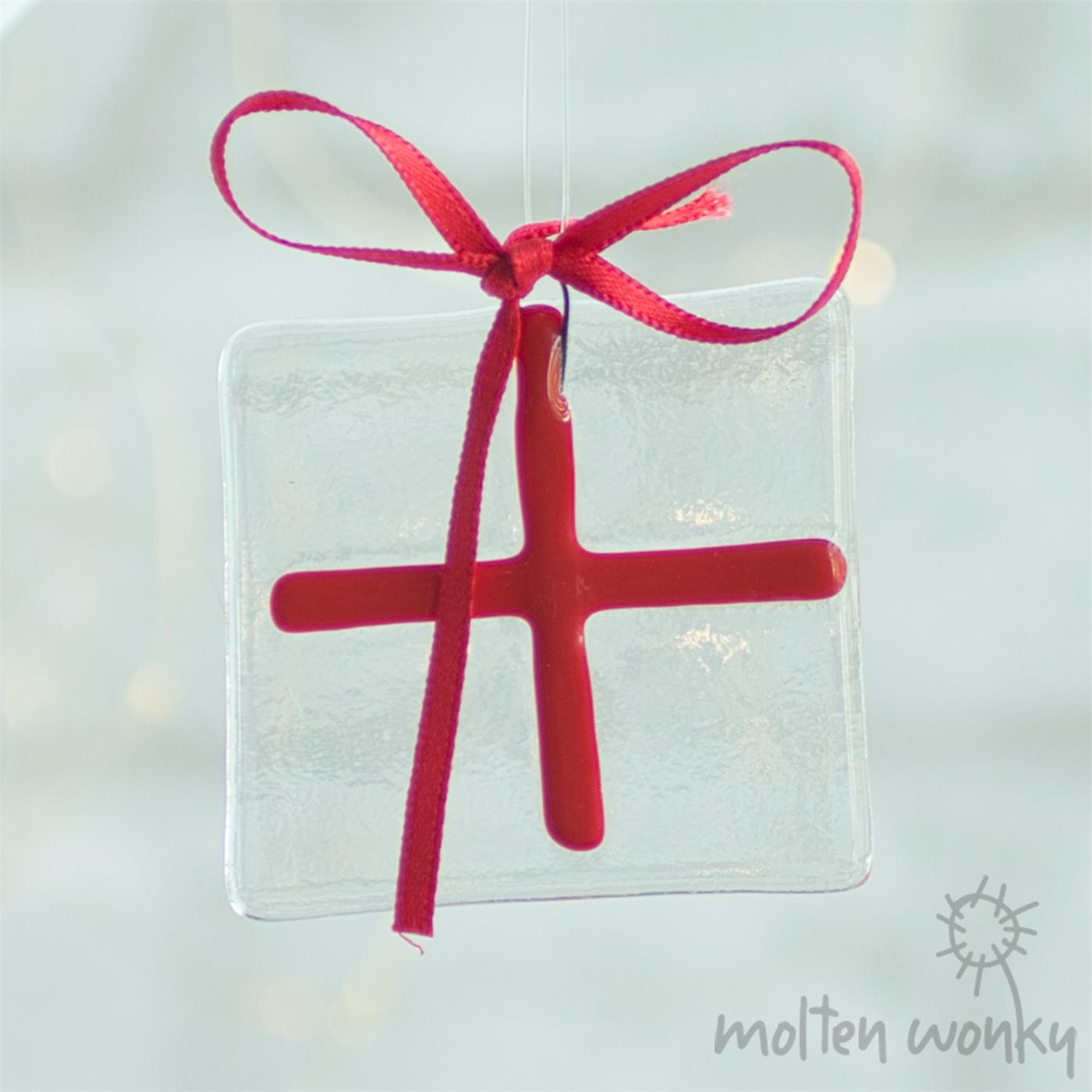 Our clear Present is hand cut from a sheet of clear transparent glass and has red glass rods over laid before it's fused. Once cooked we add red ribbon that is tied in a bow on top. Present also has a nylon loop you can hang it from.